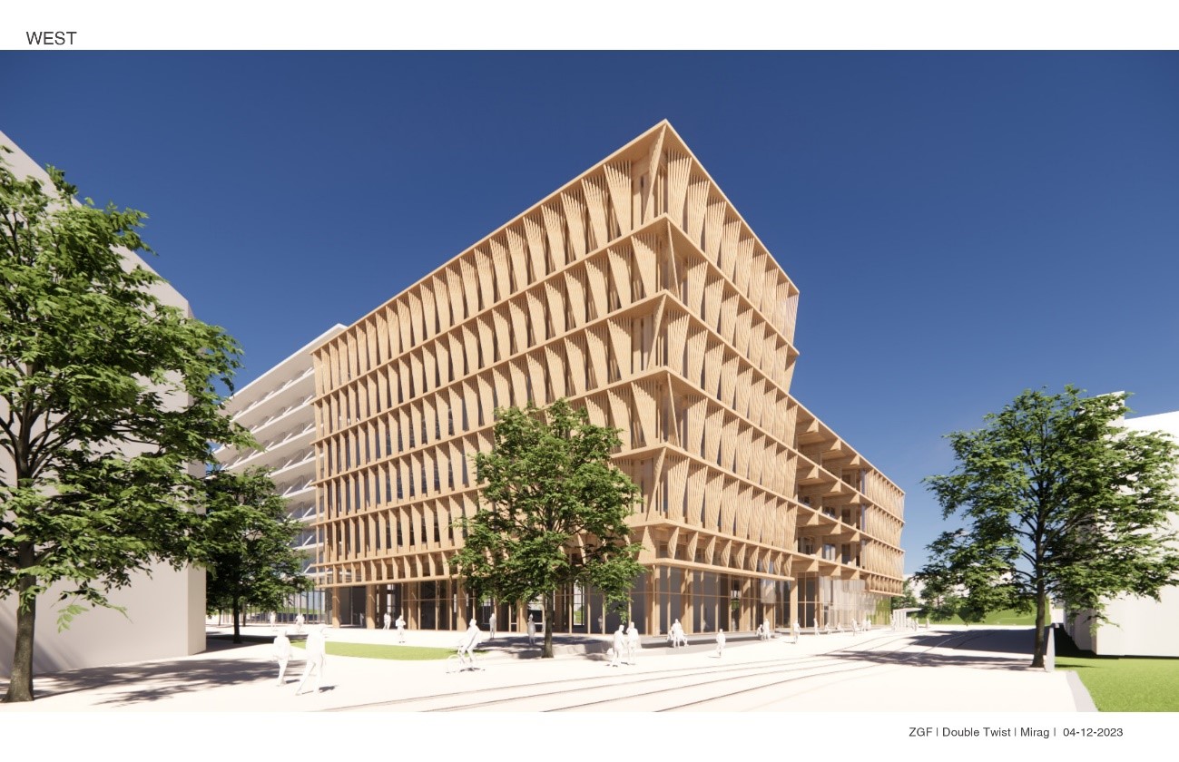 Visión oeste del edificio del IBE. Credito a ZFG, Double Twist y Mirag.