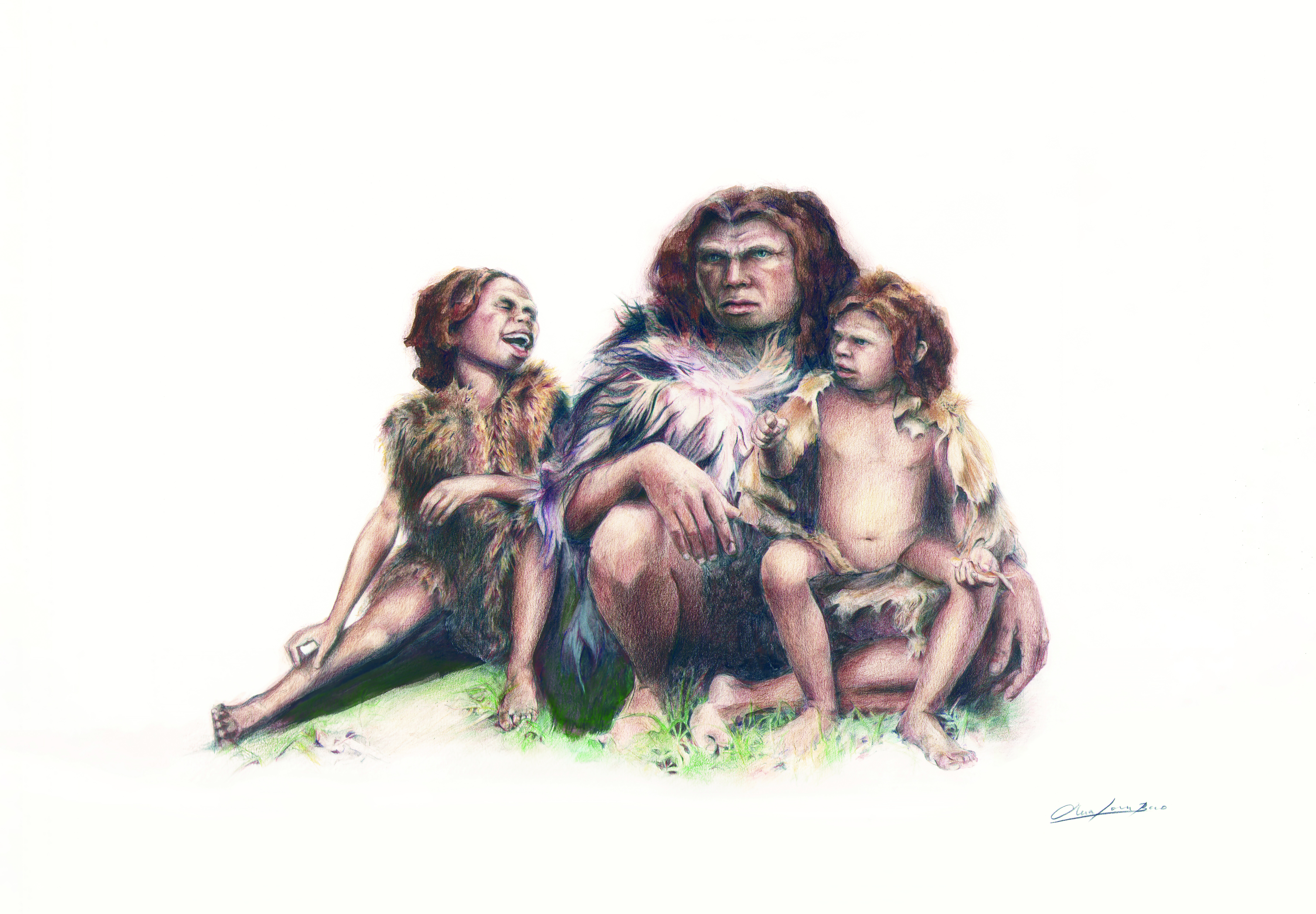 Ilustración de los tres individuos neandertales de la Cova Simanya. Autoría: Ana Lombao.
