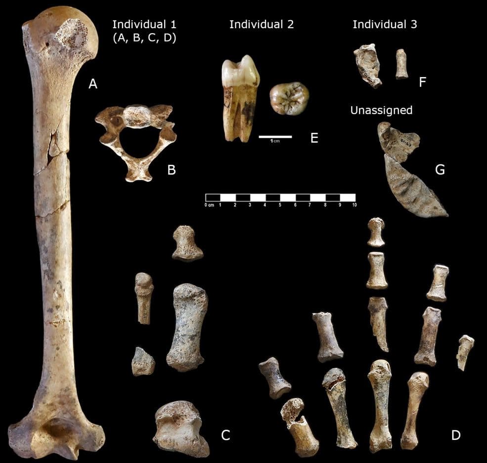 Los restos corresponden a tres individuos: un adulto, probablemente una mujer, un joven de unos 11 o 12 años y un niño de unos 7 – 8 años. "Destaca especialmente el individuo adulto, del cual se han identificado restos de ambos brazos; entre ellos hay un húmero entero y una mano prácticamente completa, y también de los pies, además de diferentes vértebras y costillas", comenta Antonio Rosas, director del Grupo de Paleoantropología del MNCN-CSIC que ha coliderado el estudio.