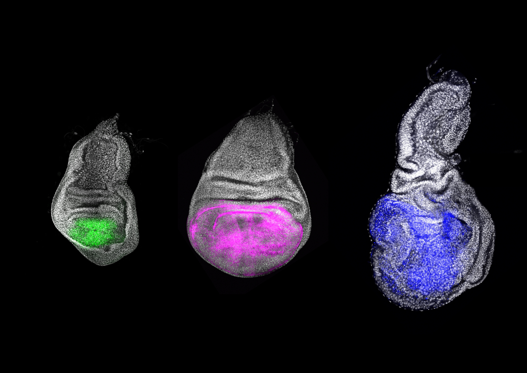 Cèl·lules imaginals precursores de l'ala adulta de Drosophila melanogaster: L'absència de Chinmo en les cèl·lules imaginals suprimeix el creixement de l'ala (esquerra) comparat amb el teixit precursor de l'ala control (centre), mentre que la sobreexpressió del gen Chinmo indueix un sobrecreixement del teixit, tal com succeeix en els processos tumorals (dreta). Imatge de Panagiotis Giannios.