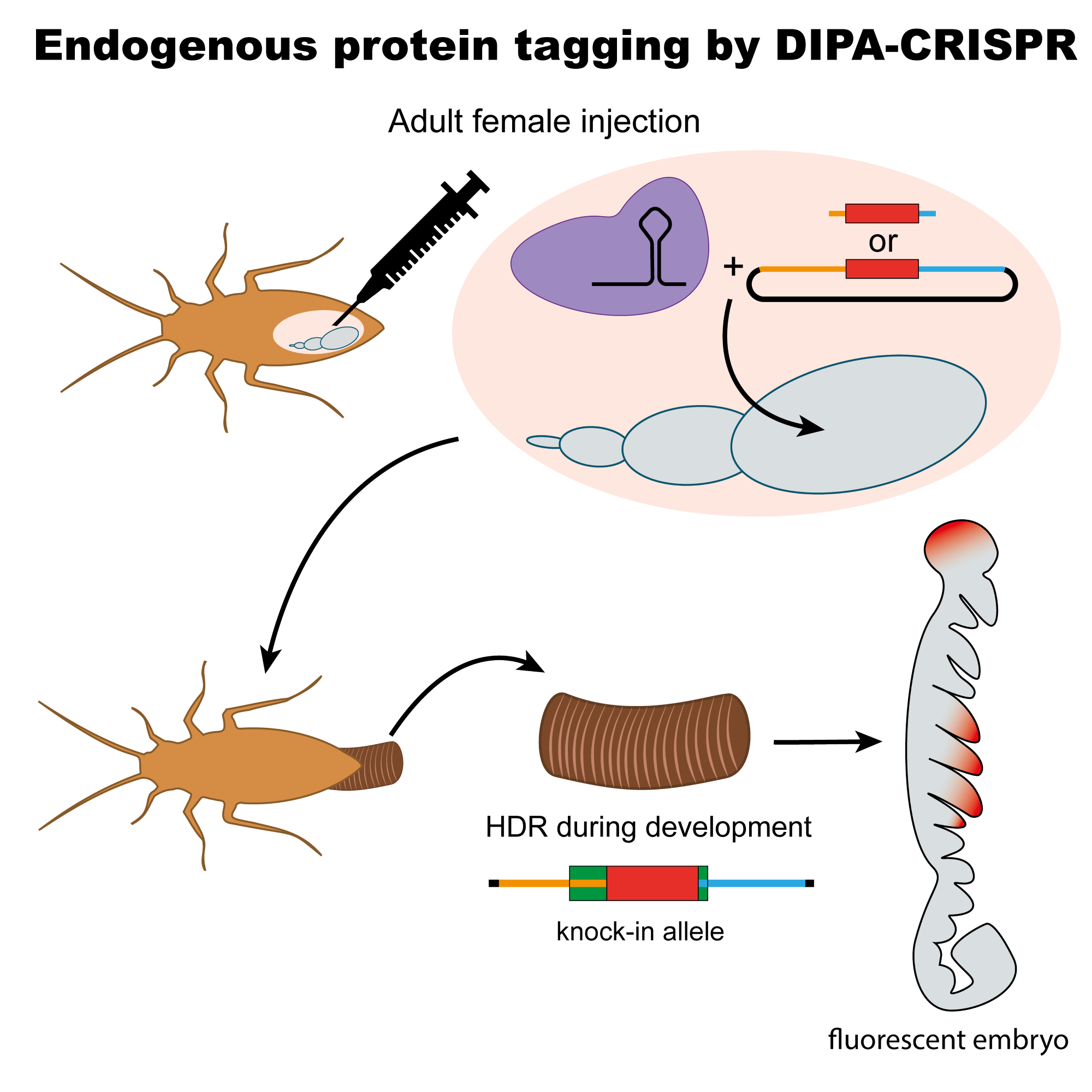 Protein tagging using DIPA-CRISPR: graphical representation of the process of injecting the gene-editing machinery into an adult female German cockroach to insert the mCherry fluorescent protein gene (knock-in) at a location that allows visualization of the protein expressed by the distal-less (dll) gene during embryo development. Credit: Alfonso Ferrández-Roldán / Cell Reports Methods.