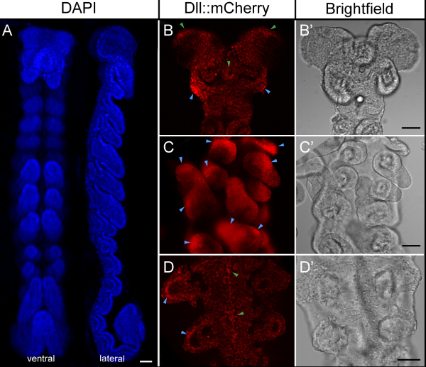 The protein expressed by the distal-less (dll) gene accumulates in the appendages and nervous system during embryonic development. The red mCherry signal reveals the location of the Dll protein in developing appendages and in the embryonic nervous system. Nuclei stained with DAPI (blue) allow visualization of tissue organization. The images show that the fusion protein is functional and illustrate its localization during cockroach development. Credit: Alfonso Ferrández-Roldán / Cell Reports Methods.