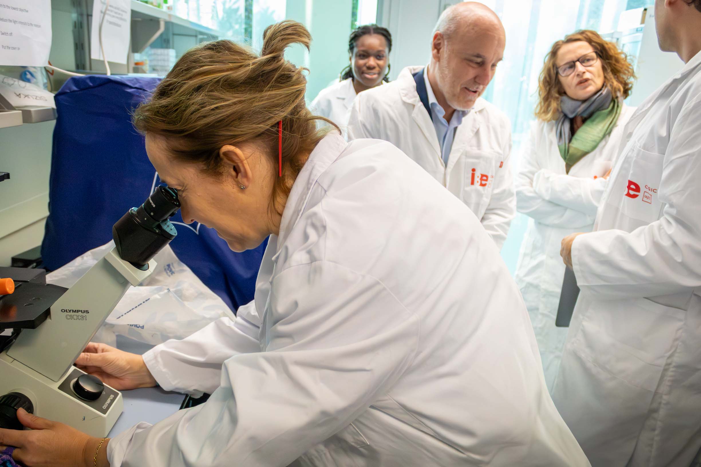 Eloísa del Pino observes a protist sample during her visit to the IBE.